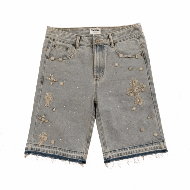 Bold by design, these jorts feature hand-set rhinestone crosses and heavyweight vintage-washed denim. Each pair is a one-of-one feel — built for those who lead, not follow.