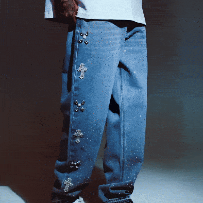 Each pair of Vandal Cross Pants is built from heavyweight, vintage-washed denim and hand-finished with icy rhinestone crosses that catch the light — and every stare in the room. No two are exactly alike.